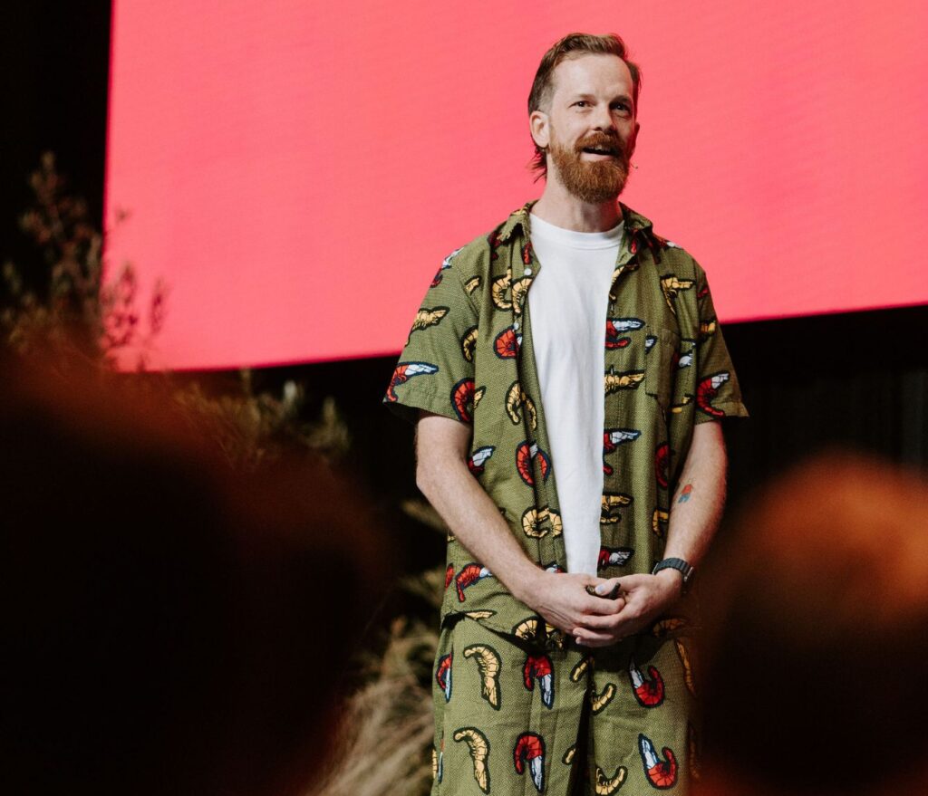 Andy Miller in his matching pyjama set at the Purpose Conference (Credit: Purpose Conference 2023, Sydney)