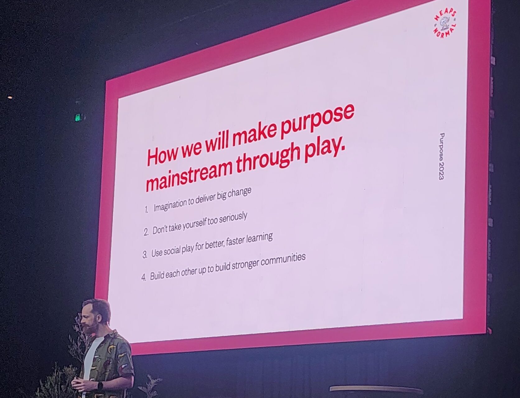 Andy Miller talking about their play philosophy. (Credit: Guts Creative at Purpose Conference 2023)