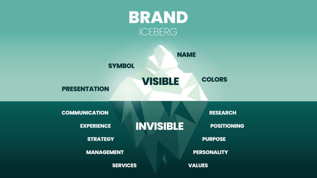 Marketers love a buzzword, so let’s avoid the jargon and start with the basics. Your brand is more than your logo. In fact, it’s an iceberg. It’s made up of both the visible parts (logo, colours, name, website, advertising) and the invisible parts below the surface (vision, purpose, reputation, positioning).