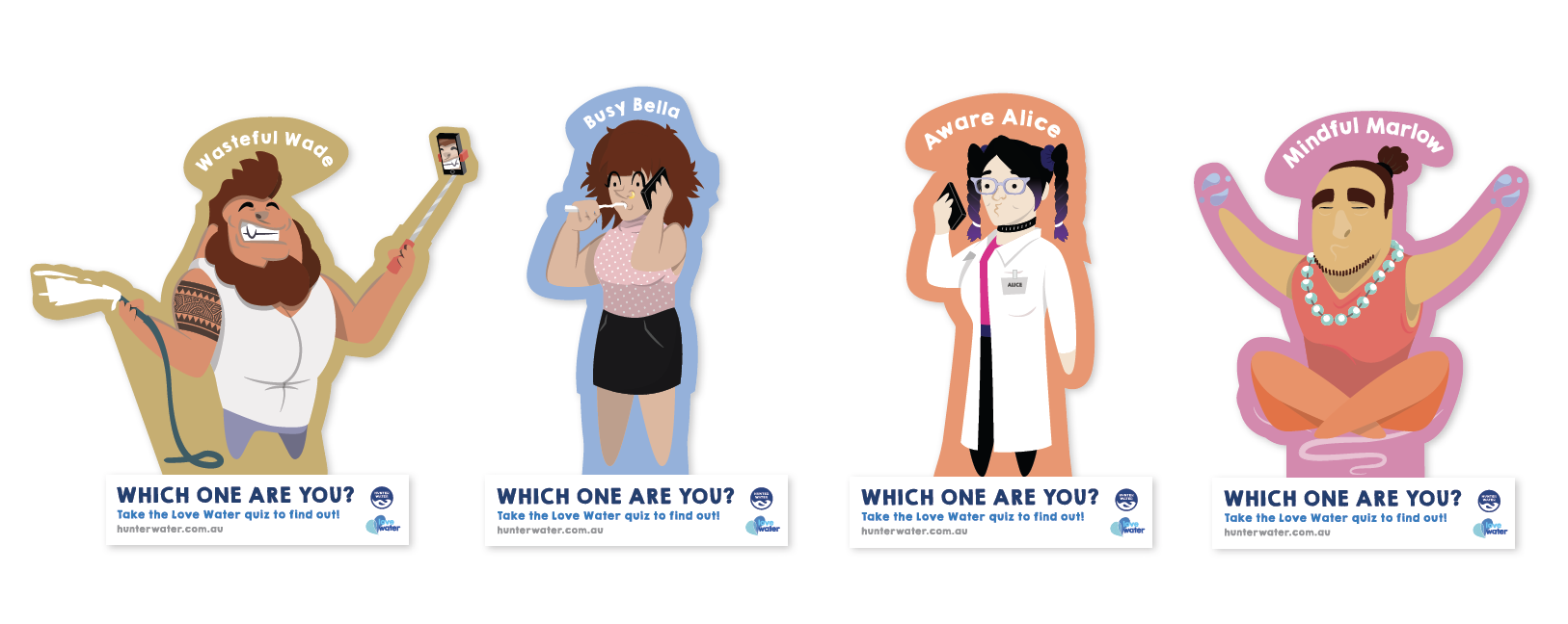 Cue ‘The Water Lovers’. We built four animated characters from actual usage  data of the most common water behaviours, bringing stereotypes to life and delivering simple tips in a completely quirky way.